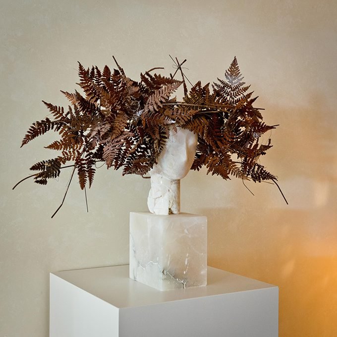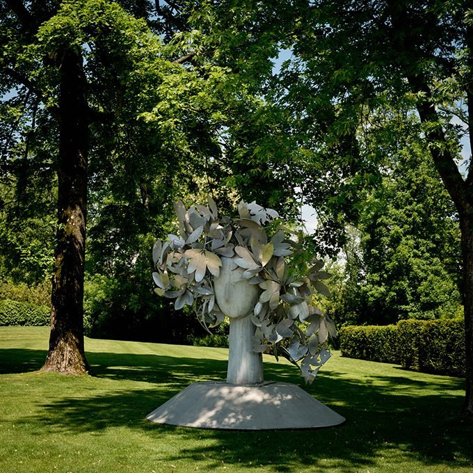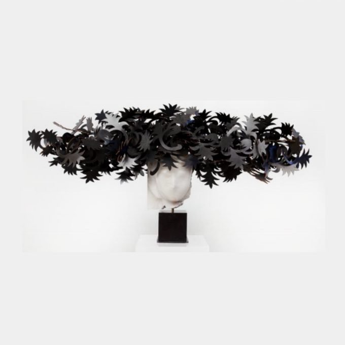 Through a magnificent pairing of metal and alabaster, Valdés’ sculptures evoke the feminine figure through a plantlife reinterpretation of the portrait theme. The stylized foliage and the materials used ensure a symbiosis between the works and their setting.