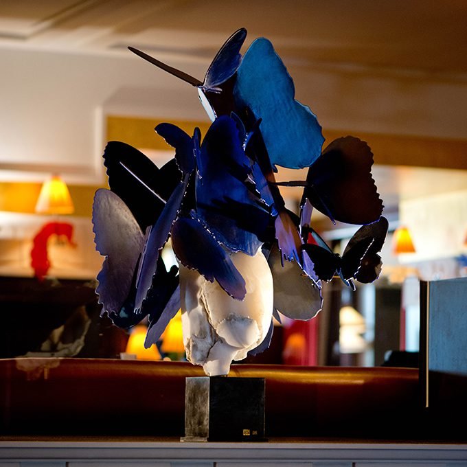 The three remaining sculptures are of a more standard size and prefer the confines of the interior space, but once again, they are able to blend effortlessly into their surroundings. One is located near the fireplace and welcomes guests upon their arrival. Another stands in the spot usually occupied by the iconic elephant in the La Réserve lobby, while the third has opted for the more intimate setting of the Café Lauren.