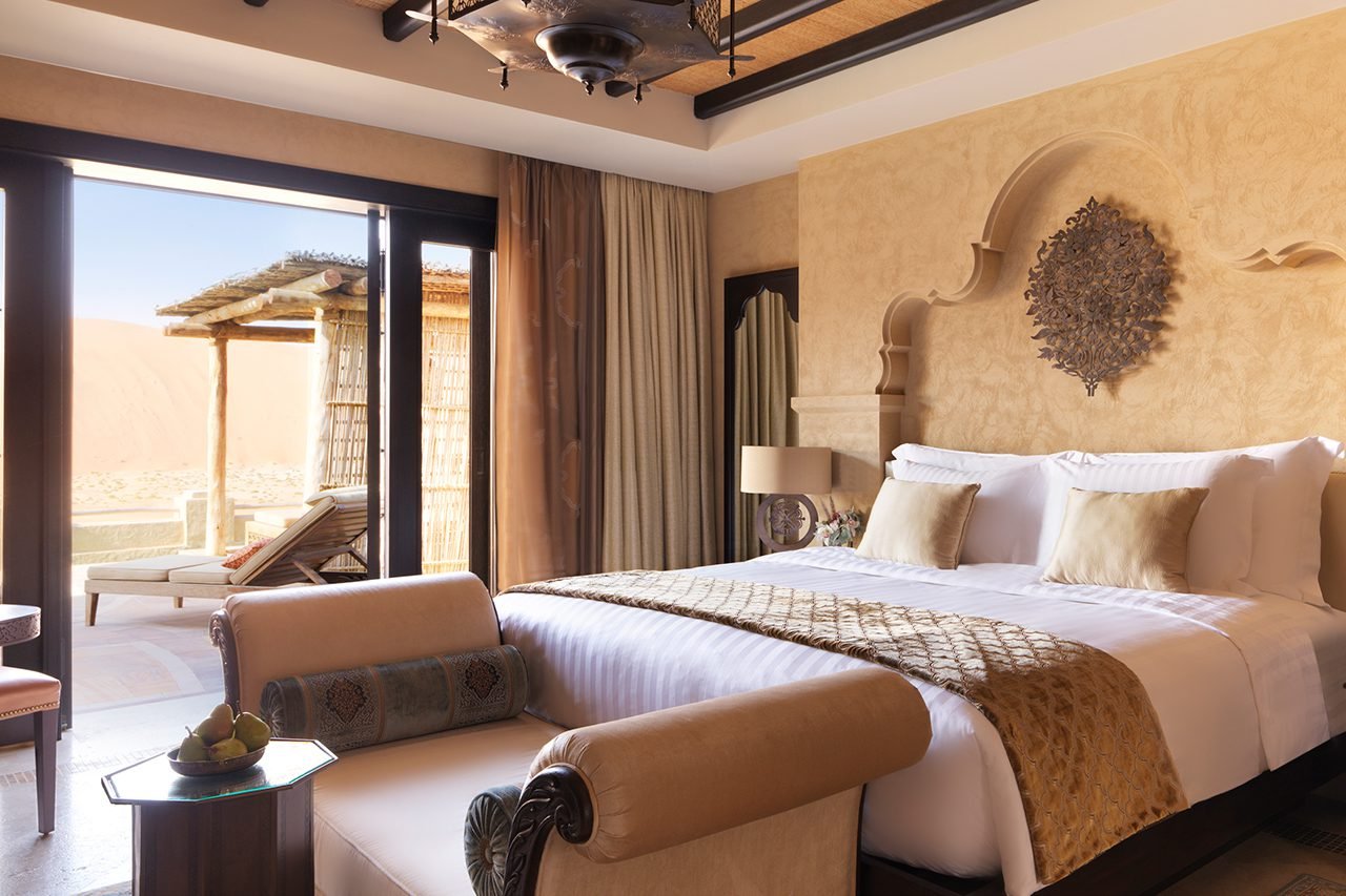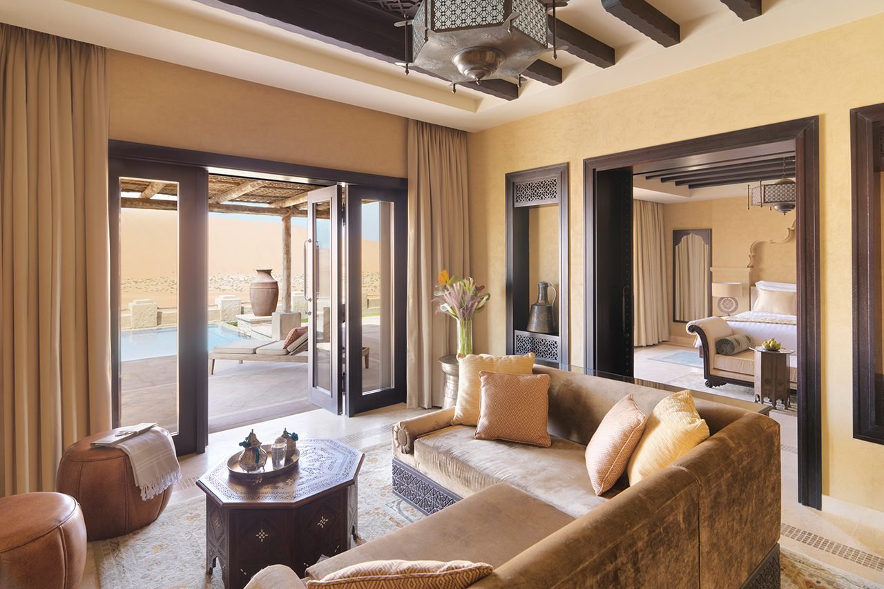 Each of the 206 elegant rooms, suites and villas at the Resort offer picturesque desert views. With earthy hues, the interiors are inspired by the simple grandeur of an old desert fortress and feature locally hand-crafted furnishings, rich carpets, embroidered fabrics and bronze chandeliers.