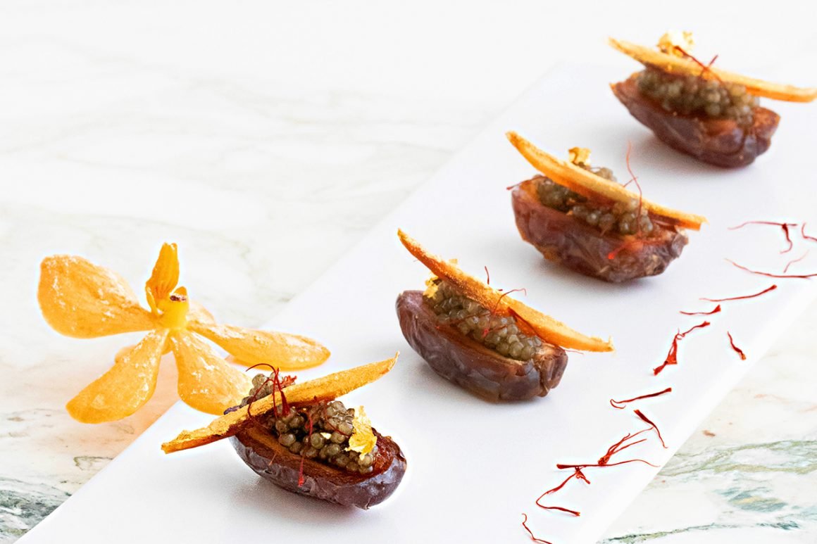 The signature dish features the most expensive caviar in the world, the 24-karat Gold Almas Caviar, topped with 24-karat gold flakes. Other highlights include Tsar Alexei with salmon flower and white Sturgeon caviar vinaigrette, the Red Carabinero Tartar with salmon caviar, and the Caviar Aux Datte, a locally inspired dessert. Complementing the menu is an assortment of dry bubbly, tempting cocktails and a retail section of caviar to-go. The staff are trained to guide guests through their caviar choices.
