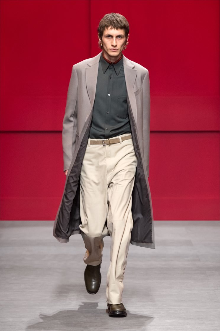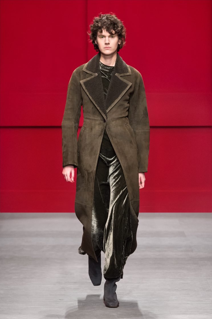 Menswear is anchored by shirting in silk twill, wool, leather and shearling that feature hand-stitched finishing by master tailors. Layering is used to bring fluidity to the winter wardrobe. Cotton bonded raincoats have a relaxed, streamlined silhouette. On the inside, they are lined with printed silk with a sly hint of hidden pattern. A lengthened and oversized English donkey jacket is designed in double wool-cashmere that is matched with leather shoulders.