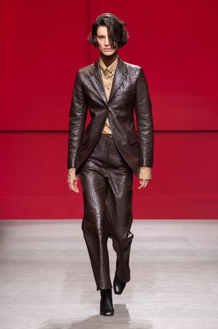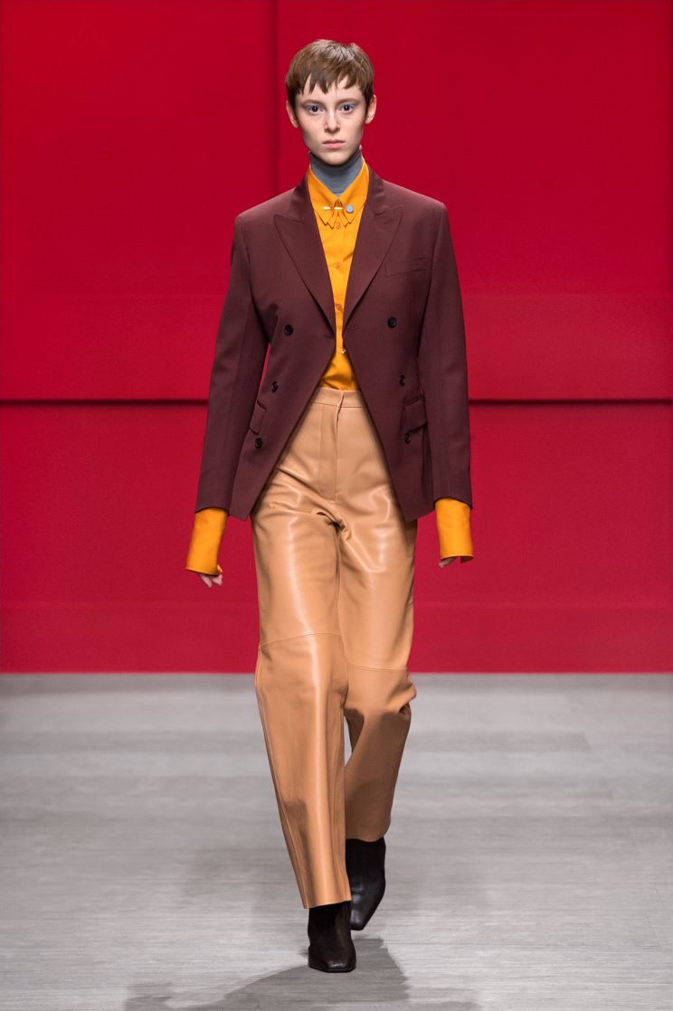 Leather dominates the women’s collection: calfskin coats with soft cashmere lining combines with pull-on knee-high boots in nabuk and ostrich. Trousers are buttery thanks to Nappa leather and wool-silk blends that are exactingly cropped. Shirt-dresses are fabricated using silk foulards materials inspired by the brand’s archives. Knits are designed to complement the leather pieces: from cashmere sweater dresses to ponchos.