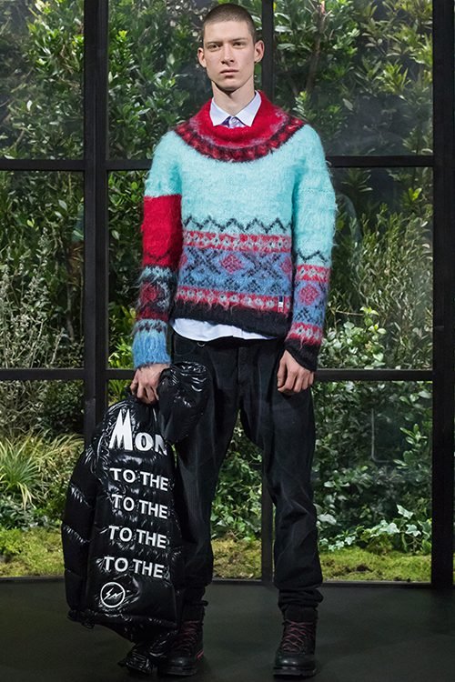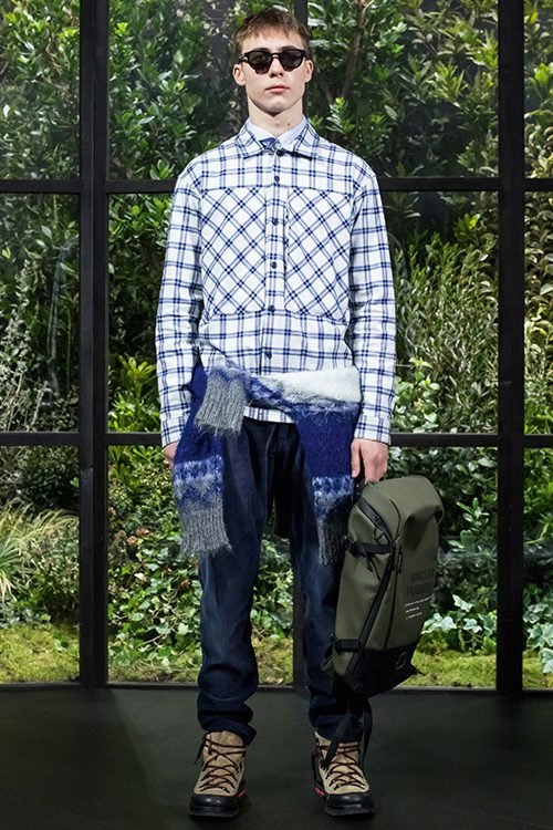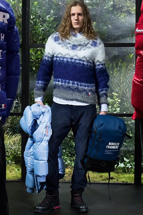 Hiroshi’s latest collection for Moncler Genius hit the stores in December. He revisited the classic Moncler puffer in colours ranging from baby blue to electric blue, and Tricolor textures reminiscent of Tetris with detachable stickers bearing the words ‘Moncler Fragment.’ The padded flannel tartan shirts, as well as the down-jackets in their 3D version, bear the words: ‘Moncler To the South, To the West, To the East, To the North.’ Oversize woollen sweaters feature watery, distilled hues. Accessories include a series of backpacks for different purposes and hiking boots for urban trekkers.