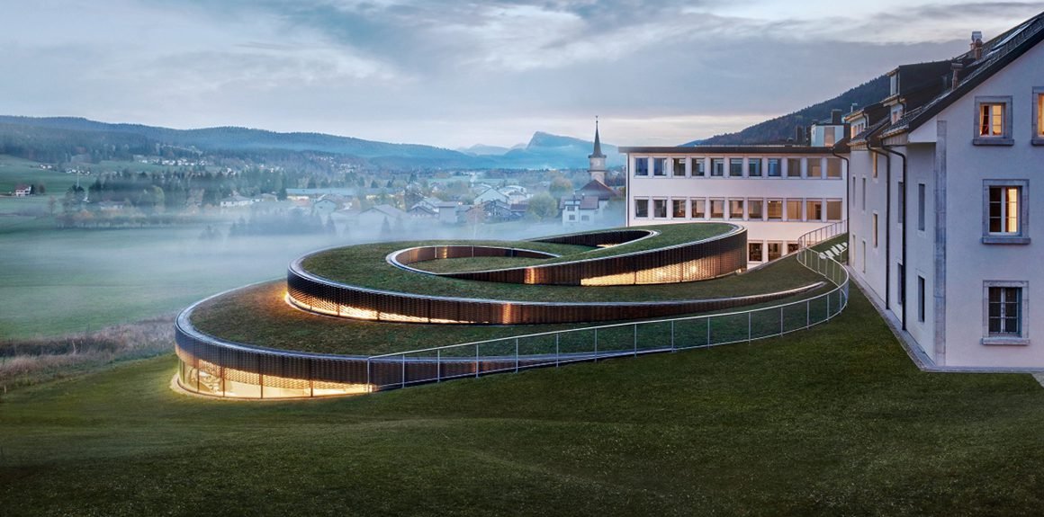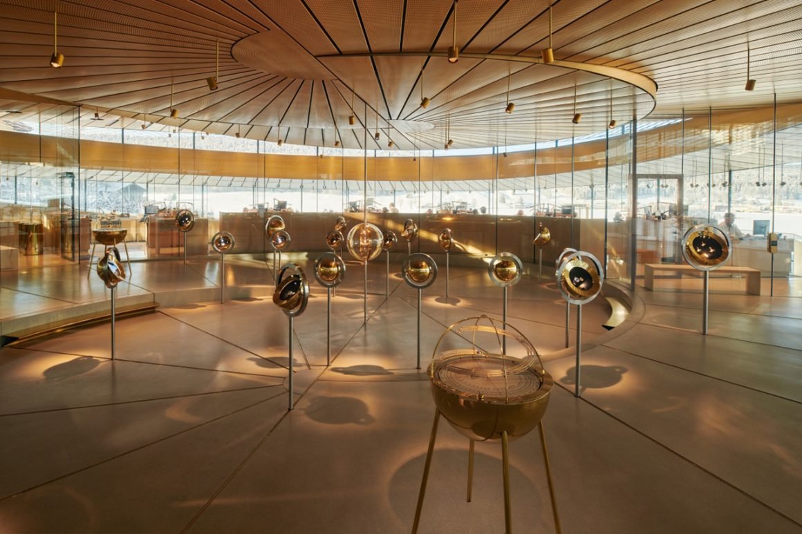 A window on the Vallée de Joux and Audemars Piguet’s craftsmanship – The Musée Atelier’s spiral-shaped pavilion rises on walls of structural curved glass. A feat of engineering and design, it is the first construction of its kind to be built at such altitude. The curved glazing entirely supports the steel roof, while a brass mesh runs along the external surface to regulate light and temperature. The green roof further helps regulate temperature, while absorbing water.