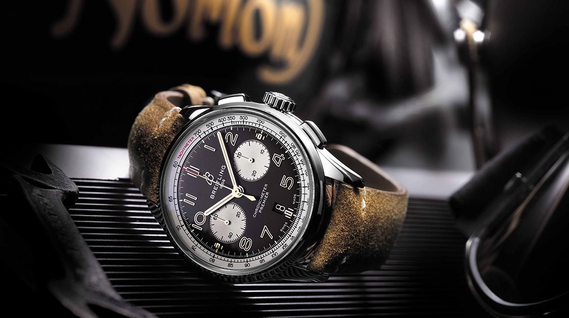 The dial is elegant in black with contrasting golden numerals and hour and minute hands. The latter two are coated with Super-LumiNova to make them legible on any route or weather conditions. The contrast on the dial is also provided by the two silver subdials: a chronograph minute counter at 3 o’clock and a small seconds subdial at 9 o’clock. The outer circumference of the dial features a black tachymeter scale on a white inner bezel around the dial, with “TACHYMETER” inscribed in red. At the heart of this watch is the Breitling Manufacture Caliber 01 which delivers a power reserve of approximately 70 hours. Collectors have the luxury of choosing between a brown vintage raw-leather strap – designed to appeal to both watch enthusiasts and vintage motorcyclists – or a stylish stainless-steel bracelet.