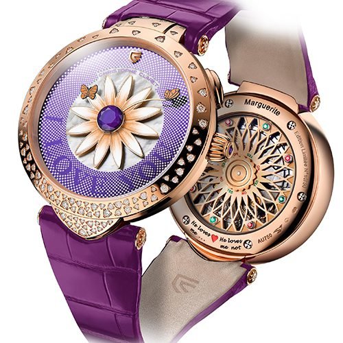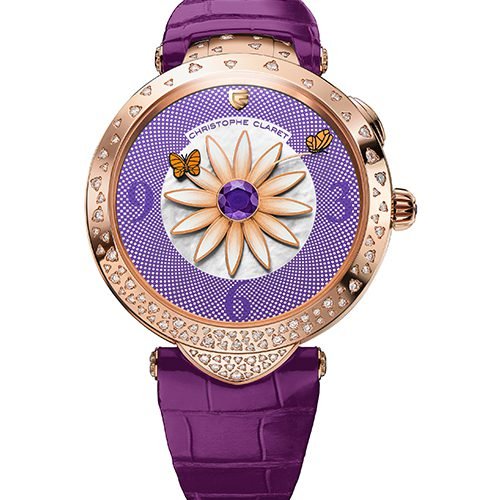 The Marguerite jewellery watch is currently available in two versions. One is in 5N red gold set with 98 champagne-toned diamonds (0.86 carat). The bezel is set with 73 diamonds, the lug at 6 o’clock set with 17 diamonds, and the lug at 12 o’clock set with eight diamonds. The Daisy pistil is crowned with a natural purple amethyst and is surrounded by twelve petals in 4N pink gold, lacquered in graded shades ranging from 5N red gold to matt white. The strap is an Aubergine-colored alligator.