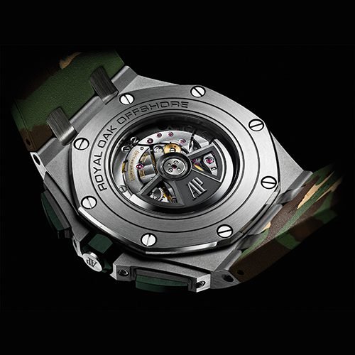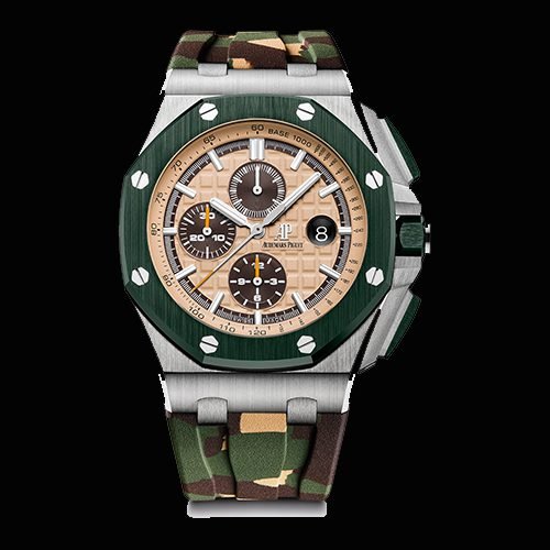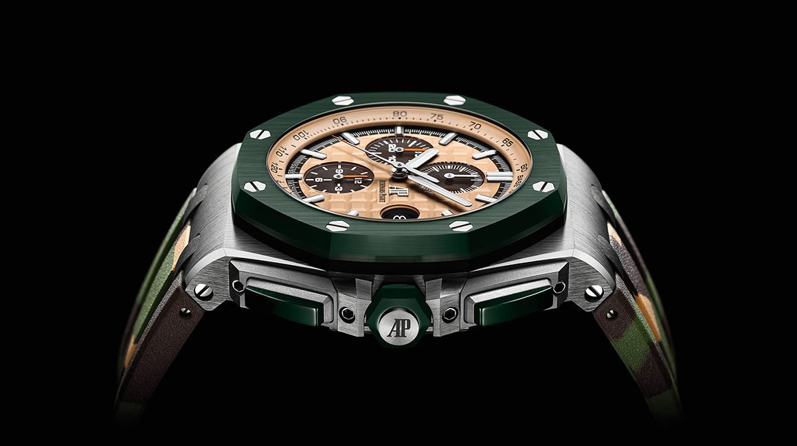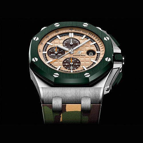 The dial is beige with the “Mega Tapisserie” pattern, brown counters, a brown external zone, white gold applied hour-markers and Royal Oak hands, as well as a beige inner bezel. The watch has a camouflage rubber strap with stainless steel pin buckle and comes with an additional khaki rubber strap.